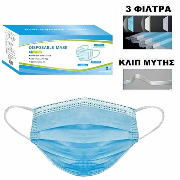 Κυτ=50τεμ.3 στρώσεις φίλτρου.} Με κλιπ προσαρμογής μύτης. Δεν γίνονται δεκτές επιστροφές σε μάσκες. Δεν φέρει ce γιατί δεν προορίζεται για γιατρούς. Είναι μάσκα γενικής χρήσης και χρησιμοποιείται από το ευρύ κοινό σύμφωνα με τα προληπτικά μέτρα κατά του κο 175x95mm